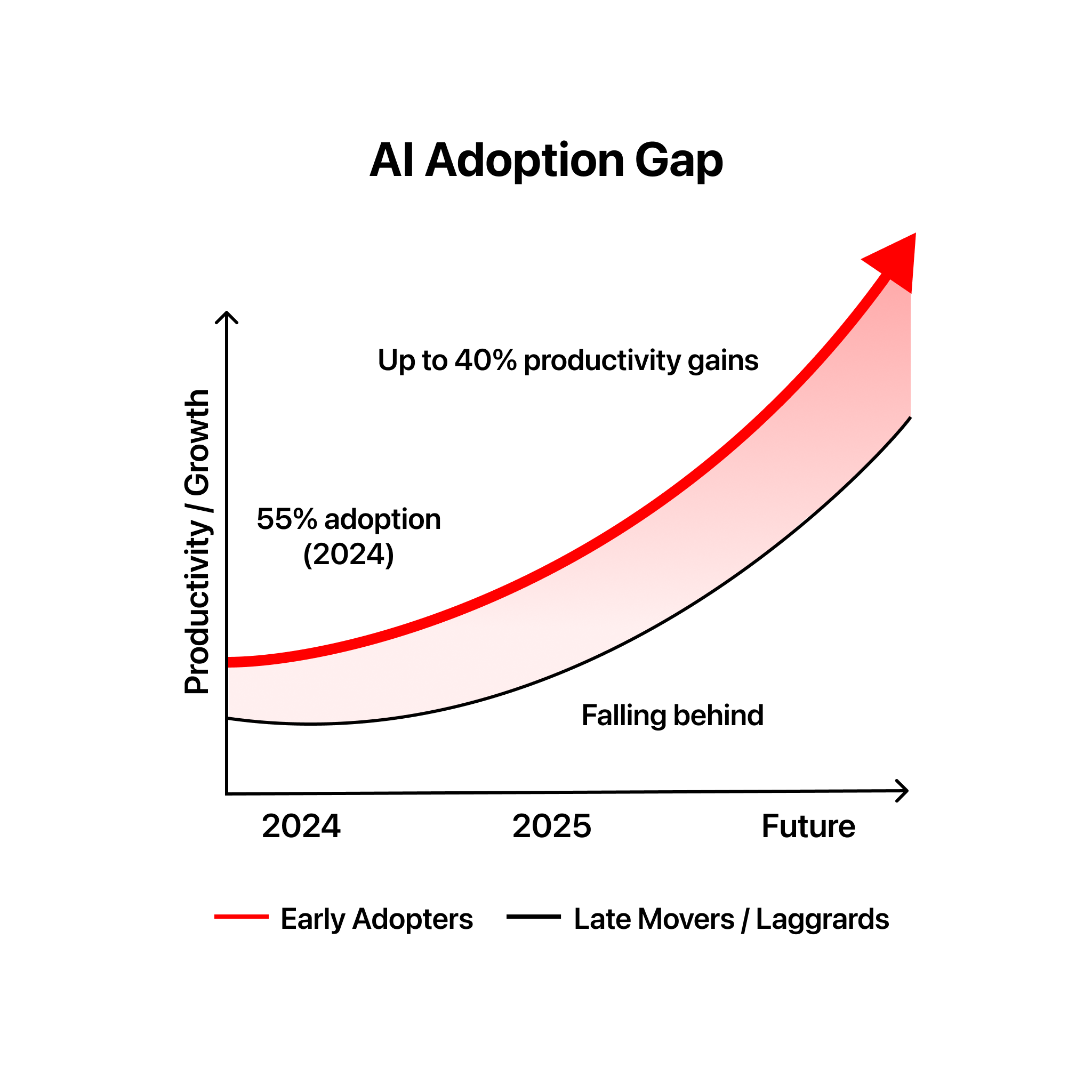 Over 78% of businesses are already using it, up from just 55% last year. Early movers are seeing up to 40% productivity gains while late adopters are falling behind.